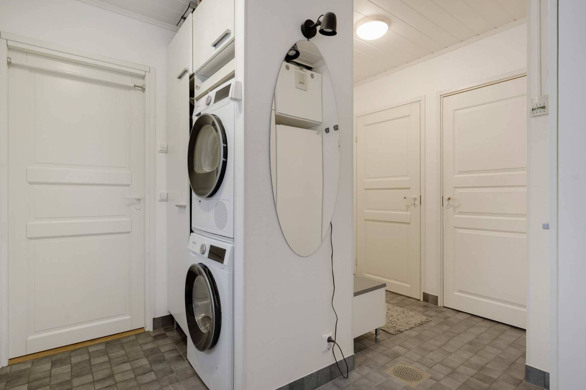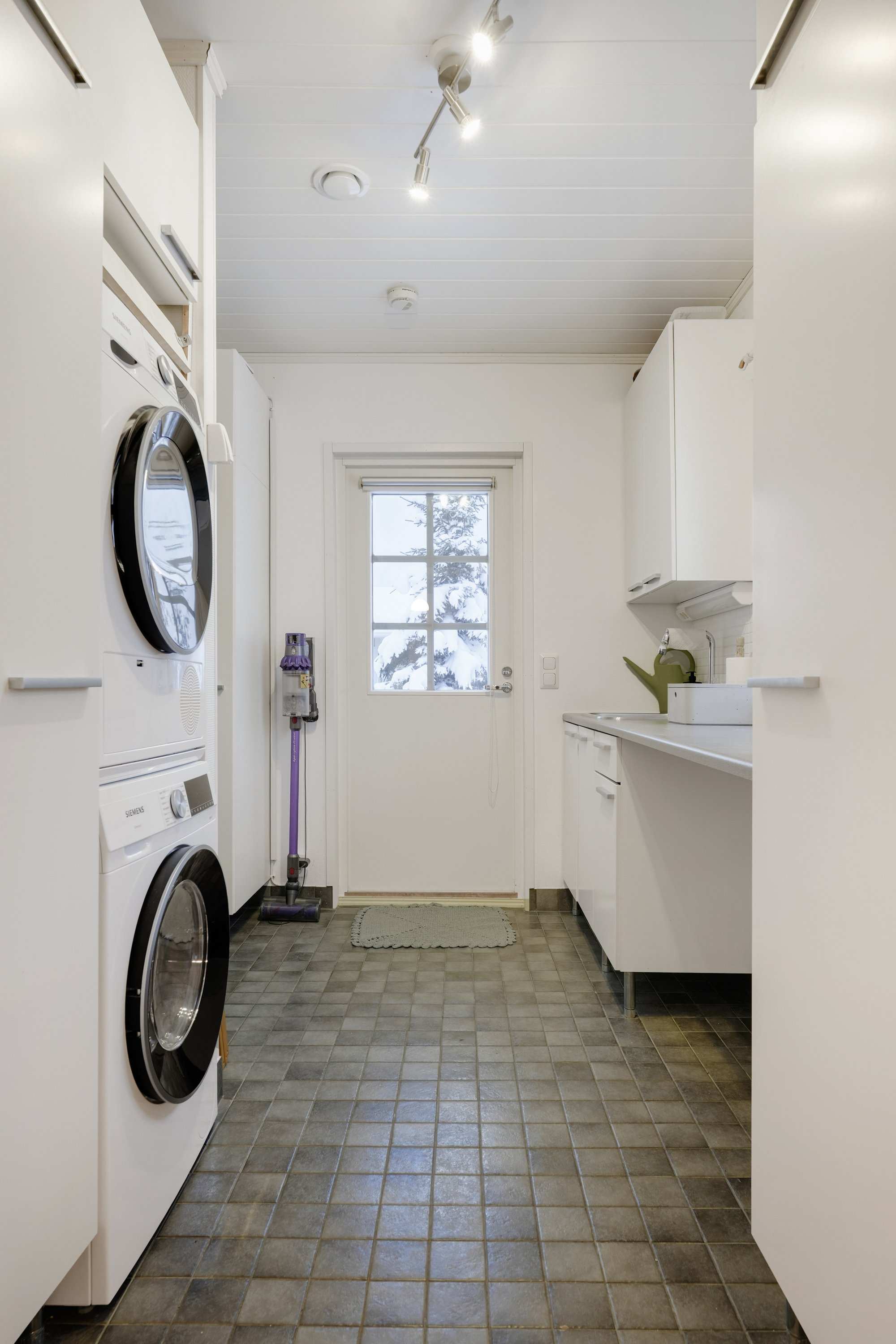 | Kodinhoitohuoneen varusteet | Pesukoneliitäntä, lattialämmitys, lattiakaivo, pöytätaso, tila pesutornille ja pesuallas |