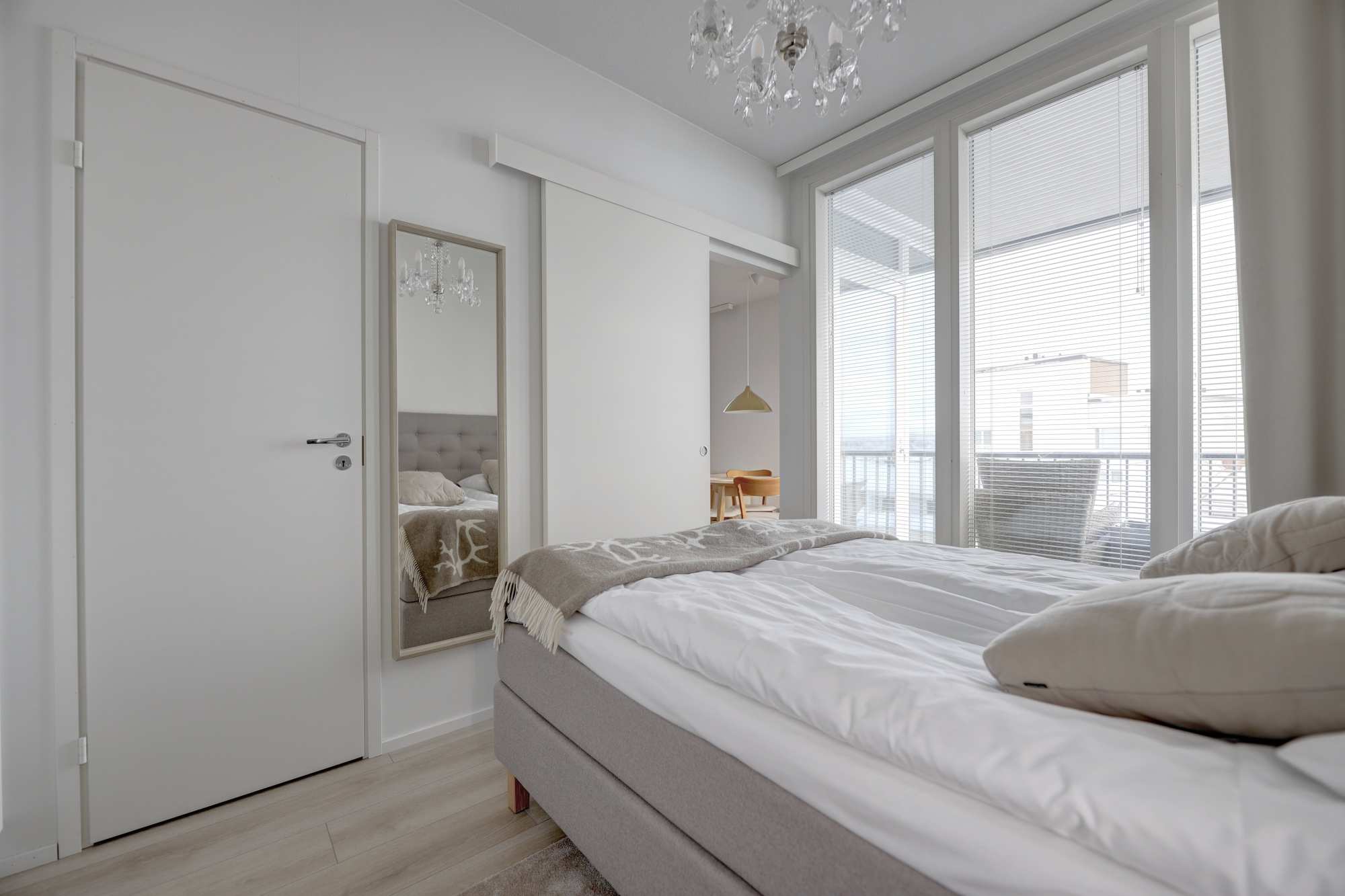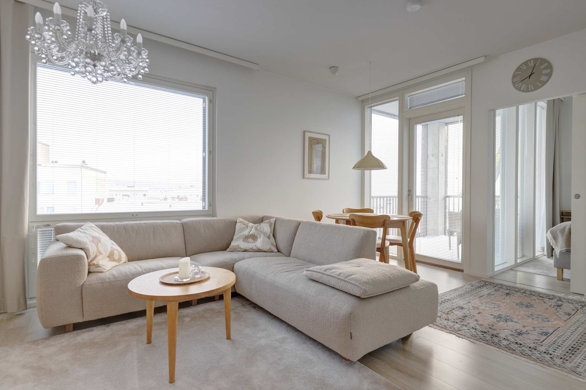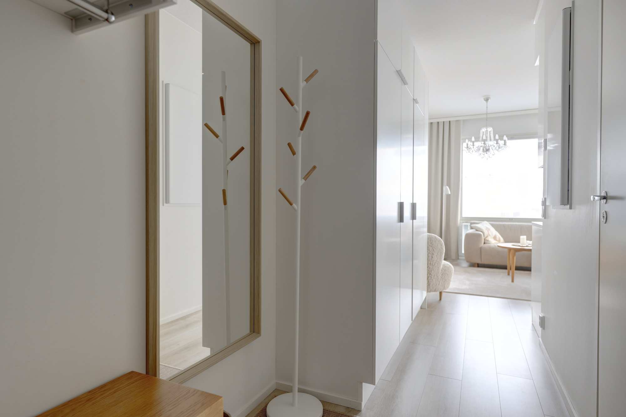 Asuntoon saapuessa huomio kiinnittyy ensimmäisenä eteisen loistaviin säilytystilaratkaisuihin, jotka säilyttävät eteisen tilan tunnun. Olohuone avautuu valoisana ja avarana yhdistyen keittiöön. Asunnossa on laadukkaasti varusteltu keittiö, jossa on integroitu astianpesukone ja jääkaappipakastin sekä induktioliesi, jotka tekevät ruoanlaitosta vaivatonta. Keittiössä huomioitu hyvin laskutilan riittävyys. Liukuoven takana makuuhuone sekä lisää säilytystilaa vaatehuoneena ja kaapistoina. Parveke sulautuu täydellisesti tämän asunnon kulmaukseen ja tarjoaa näin näkymät kahteen ilman suuntaan. Asunnossa myös oma sauna.