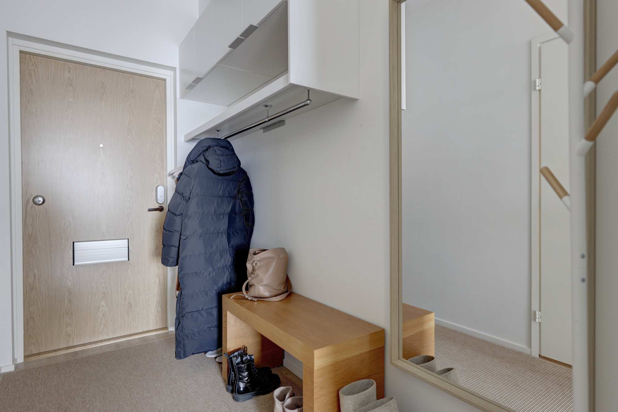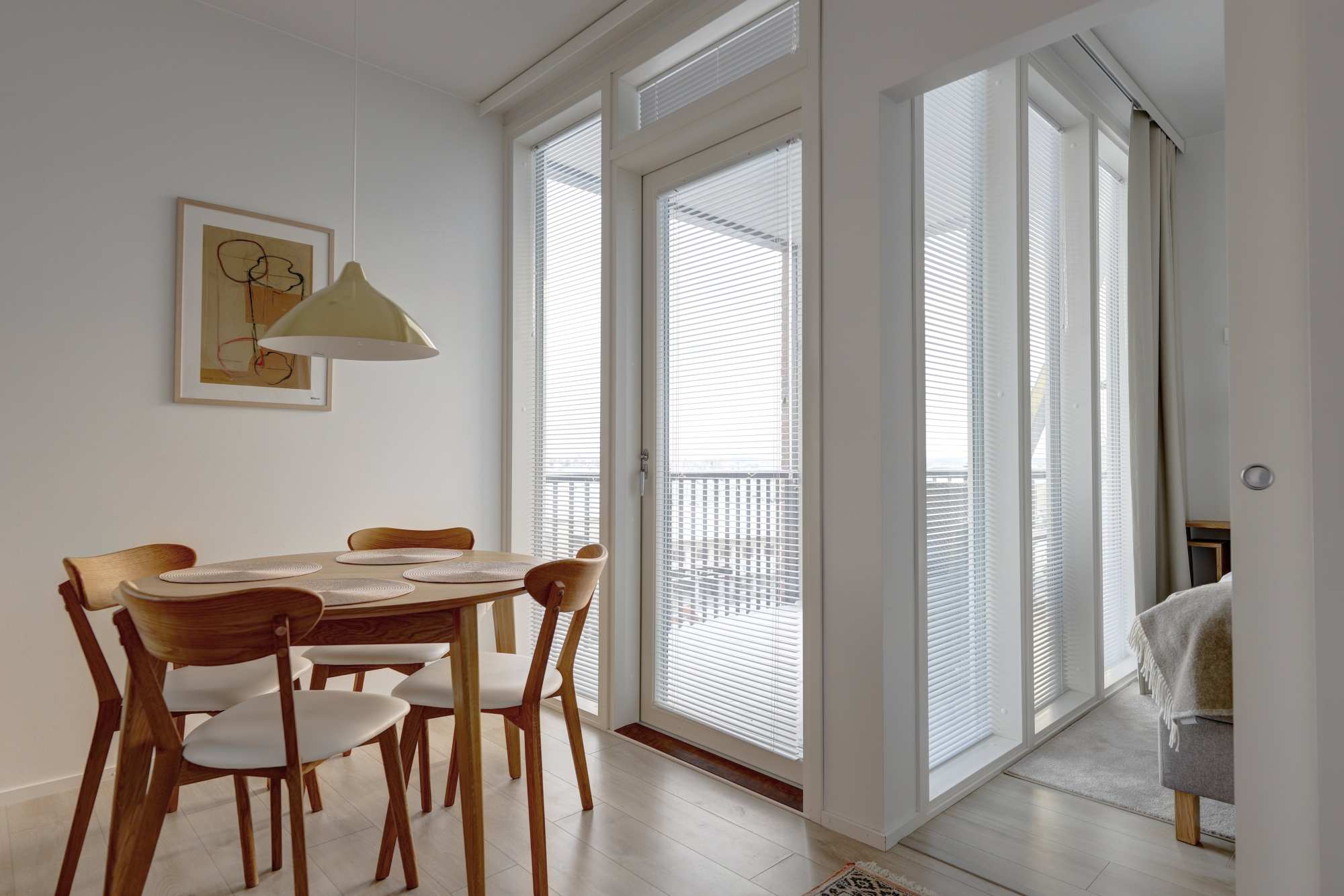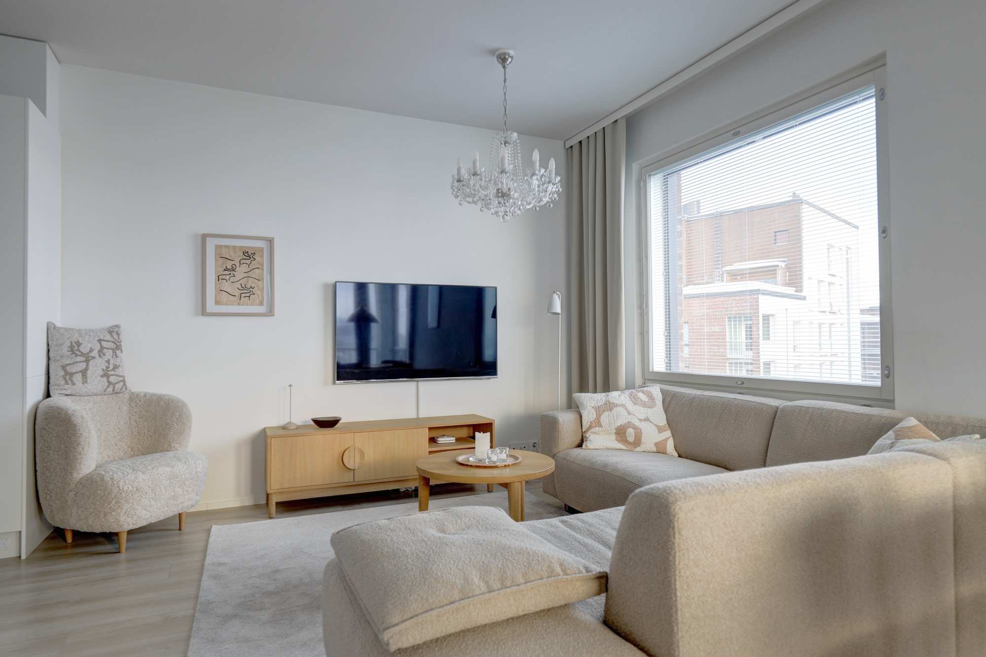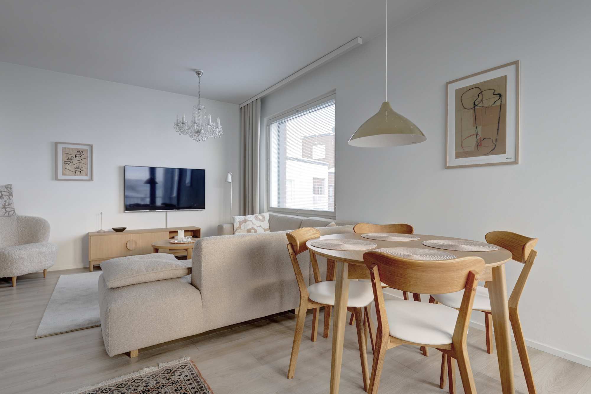 Asuntoon saapuessa huomio kiinnittyy ensimmäisenä eteisen loistaviin säilytystilaratkaisuihin, jotka säilyttävät eteisen tilan tunnun. Olohuone avautuu valoisana ja avarana yhdistyen keittiöön. Asunnossa on laadukkaasti varusteltu keittiö, jossa on integroitu astianpesukone ja jääkaappipakastin sekä induktioliesi, jotka tekevät ruoanlaitosta vaivatonta. Keittiössä huomioitu hyvin laskutilan riittävyys. Liukuoven takana makuuhuone sekä lisää säilytystilaa vaatehuoneena ja kaapistoina. Parveke sulautuu täydellisesti tämän asunnon kulmaukseen ja tarjoaa näin näkymät kahteen ilman suuntaan. Asunnossa myös oma sauna.