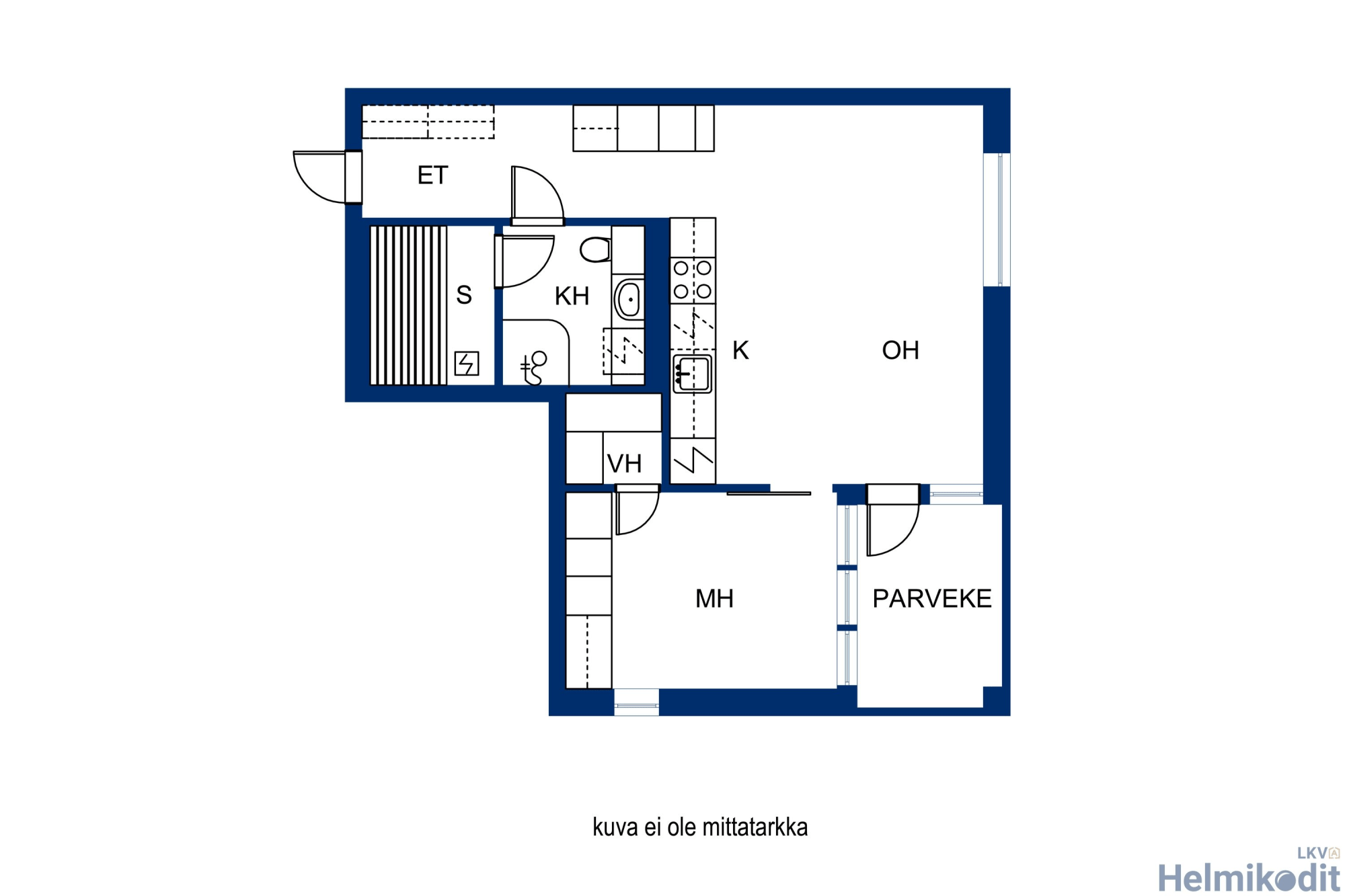 | Keittiön materiaalit | Lattia: Vinyyli Seinät: Maali |