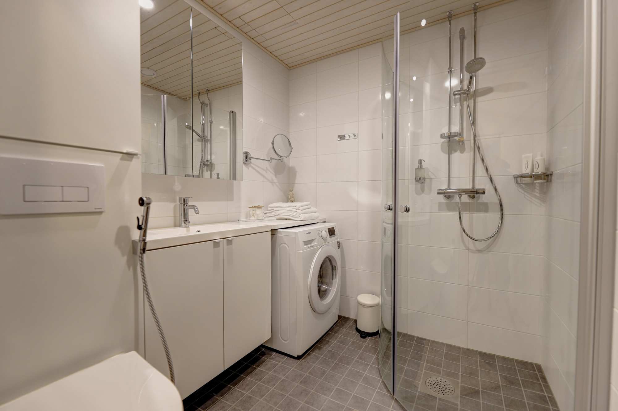 | Kylpyhuoneen varusteet | WC-istuin, suihku, pesukoneliitäntä, lattialämmitys, peili, pesuallas, allaskaappi ja bidee-suihku |